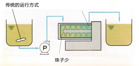 傳統磨機的運行方式 1. 粒度難以控制,分散不充分; 2. 粒度分布往往較寬; 3. 無法控制物料的溫度; 4. 在大流量高速運轉時,磨介易聚集在腔體一側,容易堵塞在出料口。 |